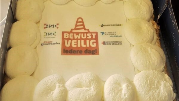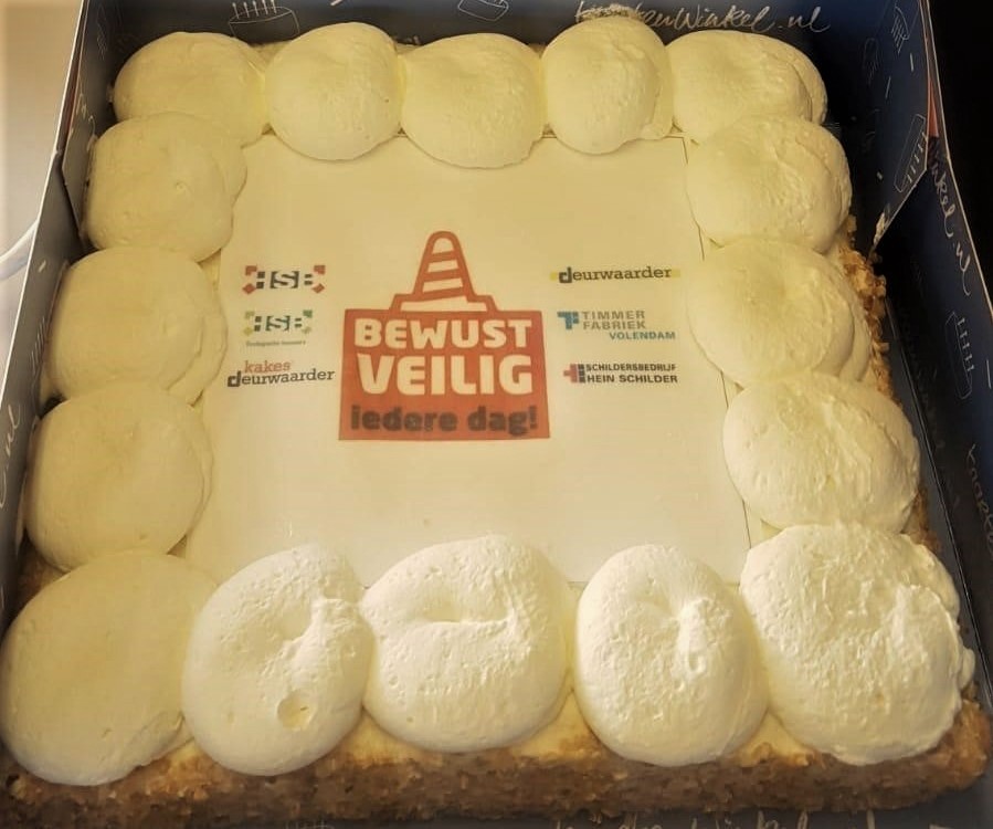 Na het serieuze gedeelte, een Toolbox-meeting en een individuele werkplekinspectie, werd deze “Bewust Veilig dag” afgesloten met koffie en een stuk “Bewust Veilig taart”.