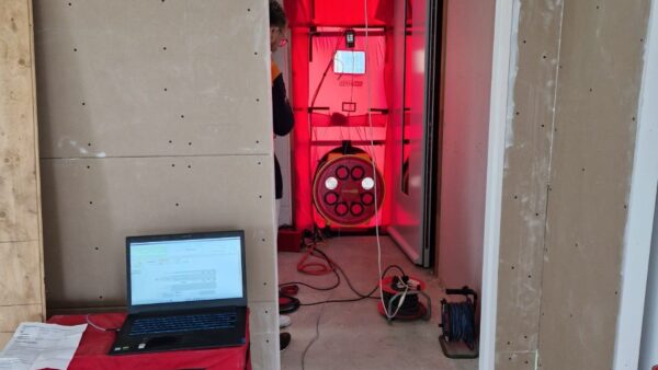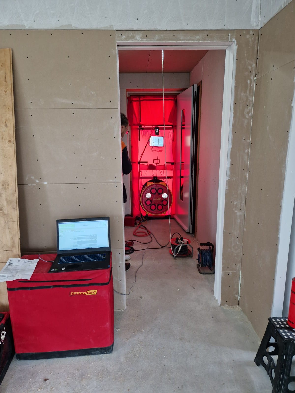 Vandaag hebben we de vrijstaande biobased woning in Beverwijk laten testen op luchtdichtheid. Het resultaat is uitstekend; een Qv 10 waarde van 0,15 voor een vrijstaande woning in deze vorm.
