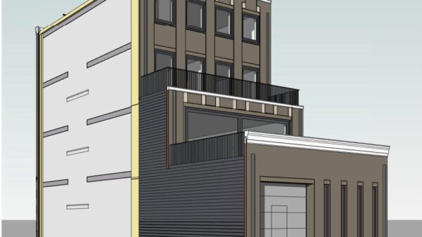 Op de begane grond bevindt zich de bedrijfsruimte, 1e verdieping woonkamer met keuken. Via een aluminium schuifpui is het dakterras toegankelijk.