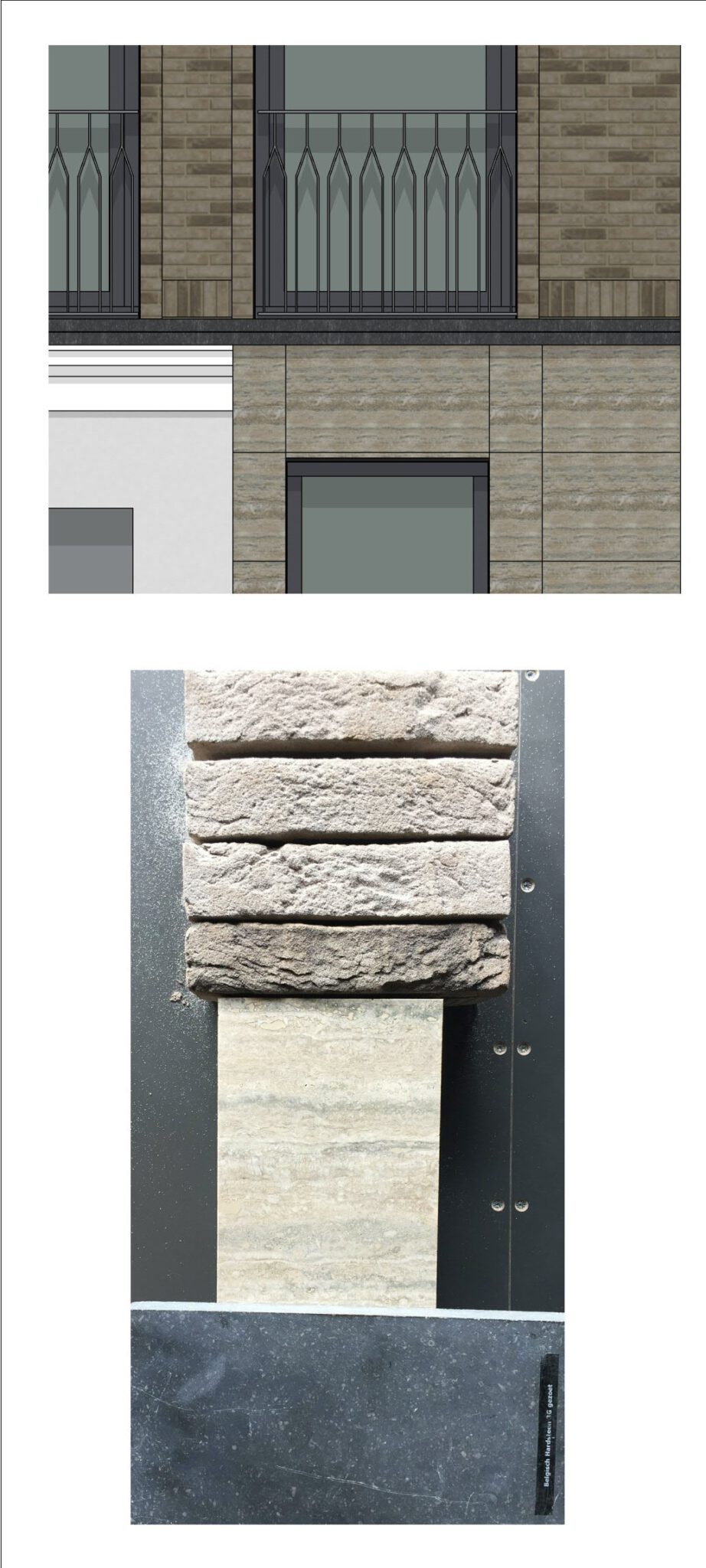 De gevels hebben verspringend metselwerk, afgewerkt met natuursteen hardsteen plint en gevelbekleding van travertin. Rond de voordeuren zit stucwerk. Het trappenhuis is van prefab betontrappen en bordessen, waarboven een lichtkoepel zit. De trappen worden betegeld.