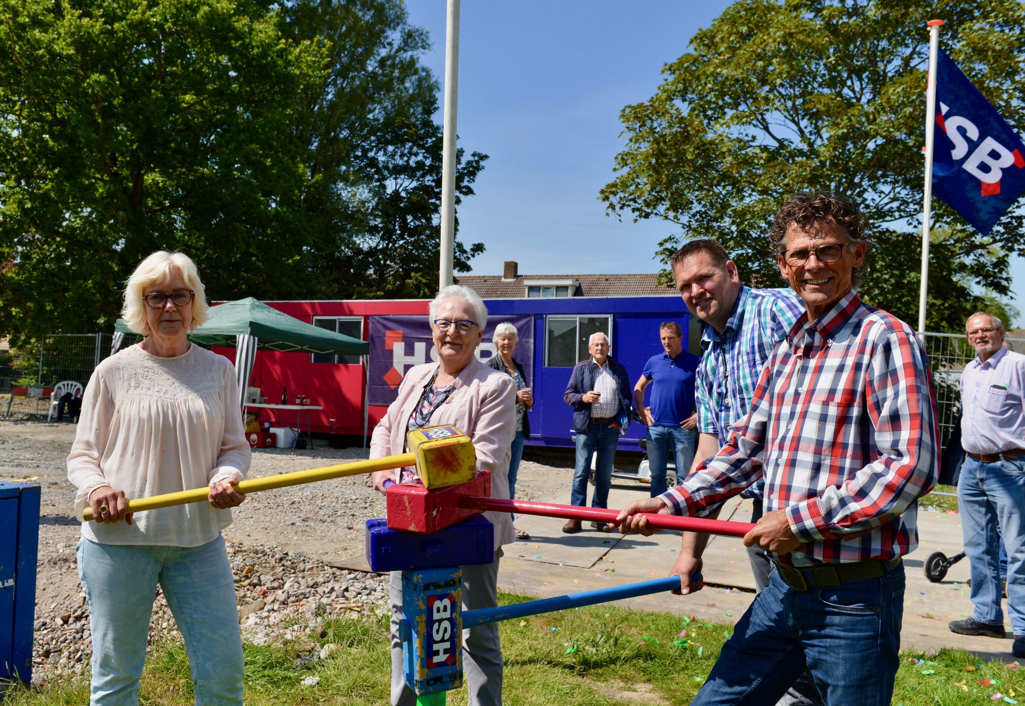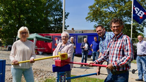 Met een paar ferme tikken heeft voorzitter Lia Wiskerke van Wijkvereniging Groeneweg symbolisch de eerste paal geslagen voor het nieuwe wijkcentrum aan de Iepenlaan in Schagen.
