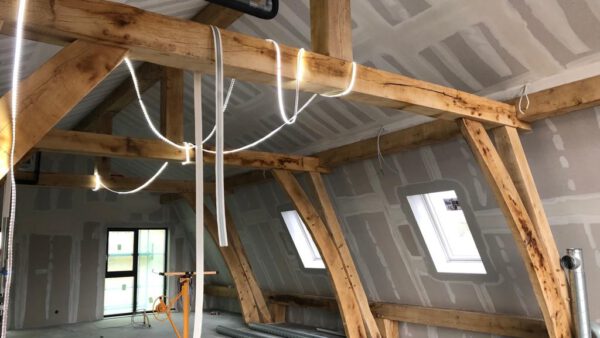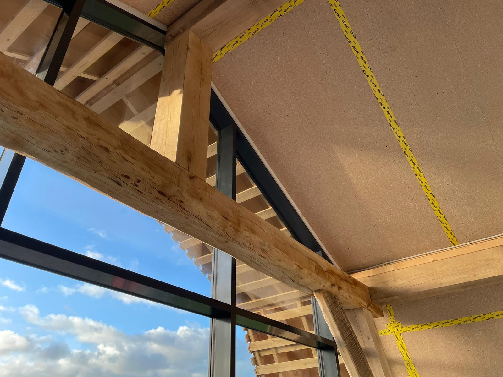 Het kantoor volledig in houtbouw, met robuuste eiken gebinten en damp-open hout skelet bouw systeem. Dakpannen met mos-sedum begroeiing en moderne installatie koel-, verwarming- en luchttechniek.